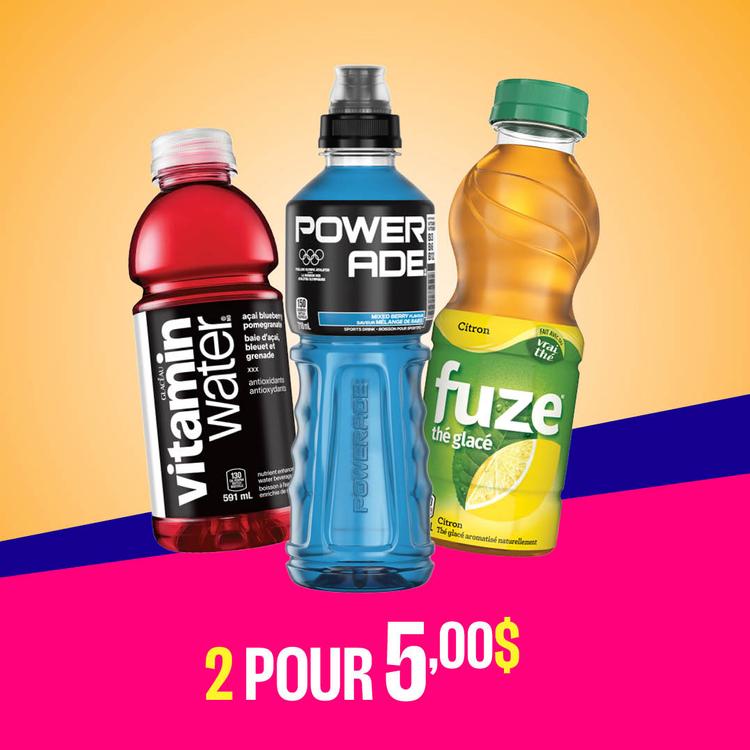 Combinez vos boissons préférées – BODYARMOR 473 ml, Powerade 710 ml, Fuze 500 ml, Smartwater 591 ml ou Glacéau Vitaminwater 591 ml – pour seulement 5 $. Choisissez-en deux, étanchez votre soif et économisez!