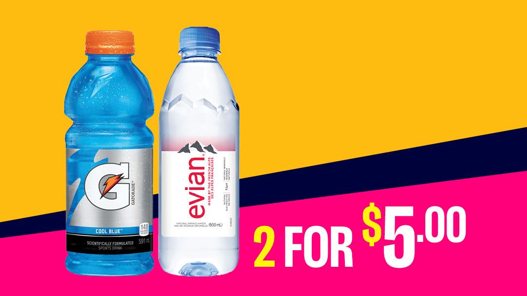 2 for $5 – Gatorade 591ml & Evian 500ml