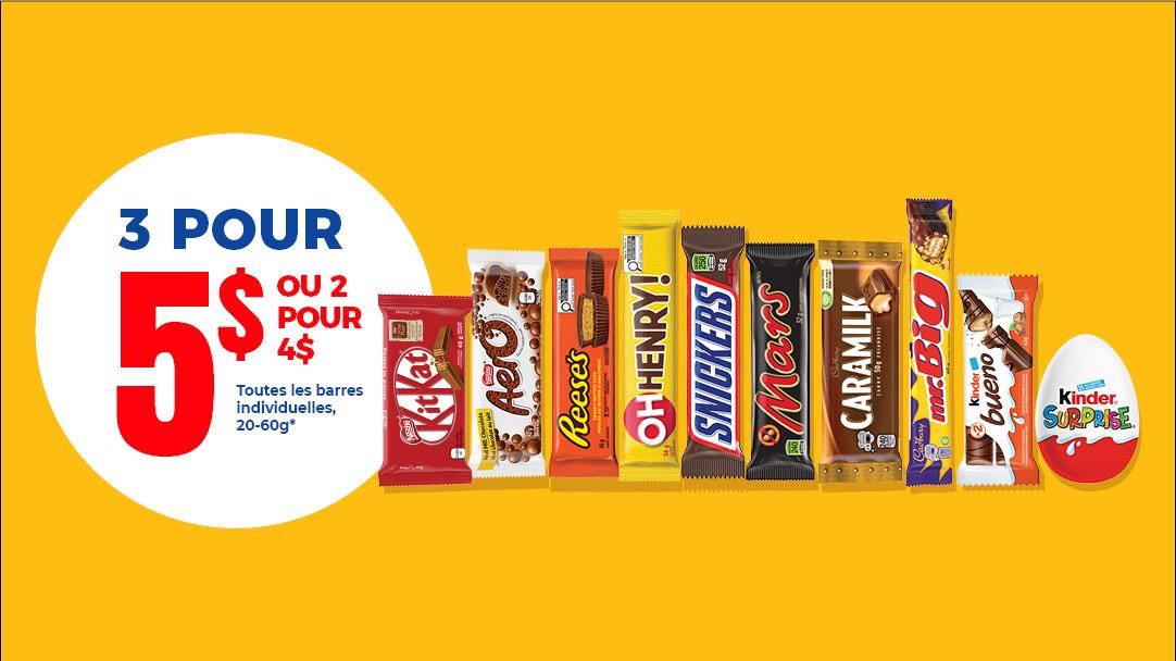 3 barres de chocolat individuelles pour 5 $ ou 2 pour 4 $!