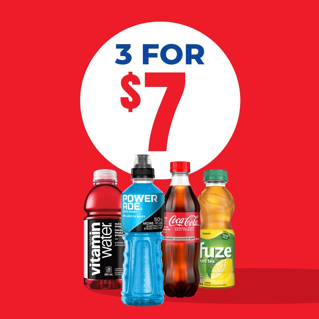 Deal runs from April 1, 2026, 12:00:00 AM to June 9, 2026, 11:59:59 PM. Buy any 3 of the following products for $7: Coca-Cola Soft Drinks (500ml), Powerade (710ml), Fuze (500ml), and Vitaminwater (591ml) at participating locations. Deposits, taxes, and levy where applicable. Limit of 9 products per transaction, per person, per day. For participating locations, visit the Map in your Journie Rewards app or the Store Locator on journie.ca to find a store where you can earn Journie Rewards. Not applicable at independent dealer locations.