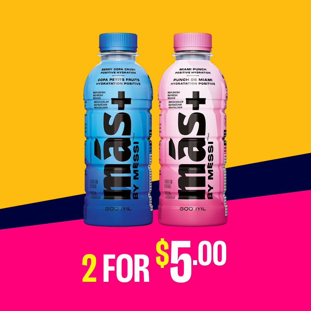 Quench your thirst and save! For a limited time, get any 2 Más+ by Messi Hydration drinks (500ml) for just $5. Stock up and stay refreshed!