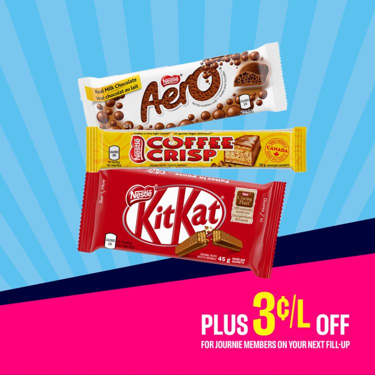 Buy 3 Nestlé chocolate bars for $5.50 and enjoy 3¢/L off your next fill-up! Discount is automatically added to your Journie™ Rewards account.
