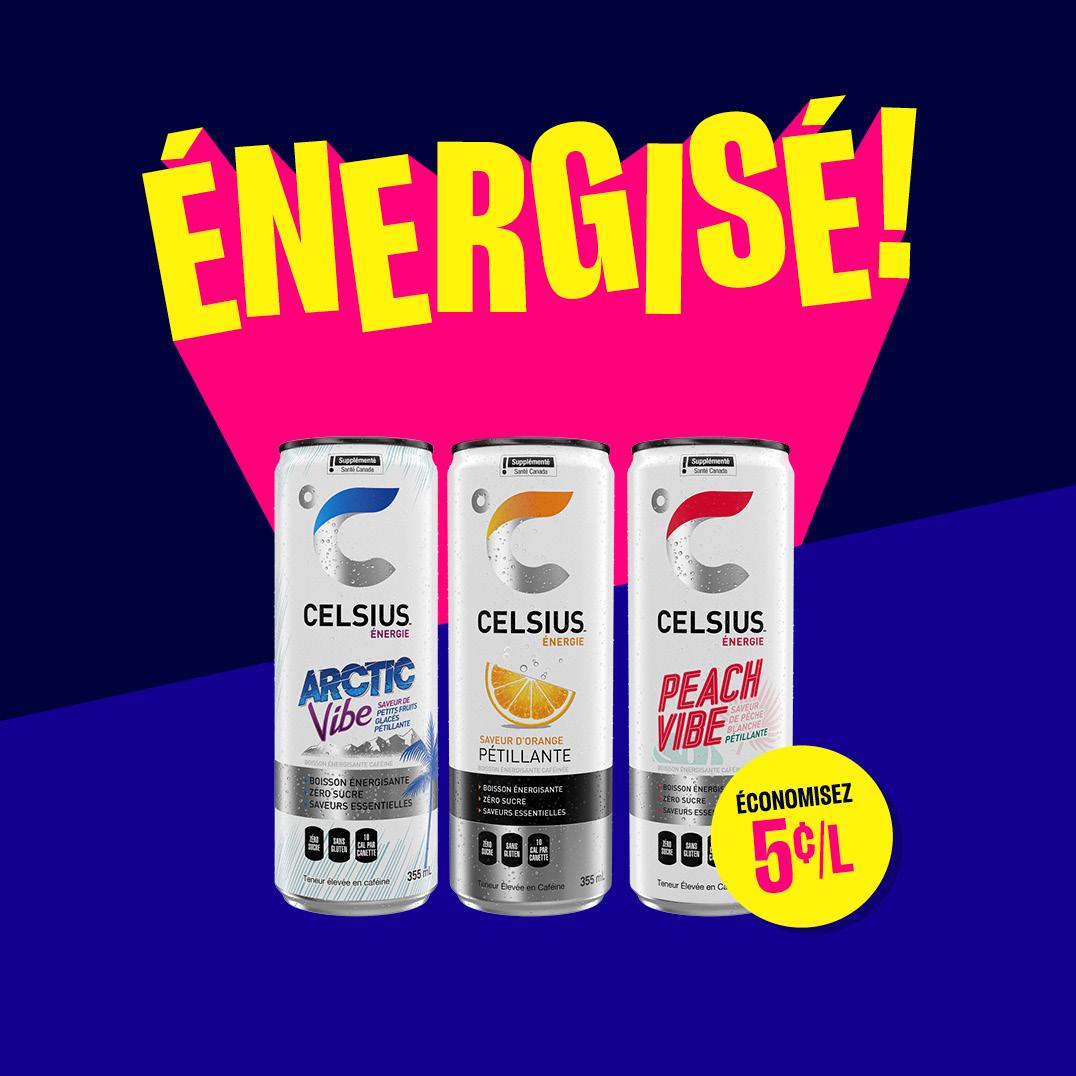 Rafraîchissez-vous avec 3 boissons Celsius pour 8 $ seulement et obtenez un rabais de 5 ¢/l lors de votre prochain plein. Un maximum d’énergie pour vous et votre auto!