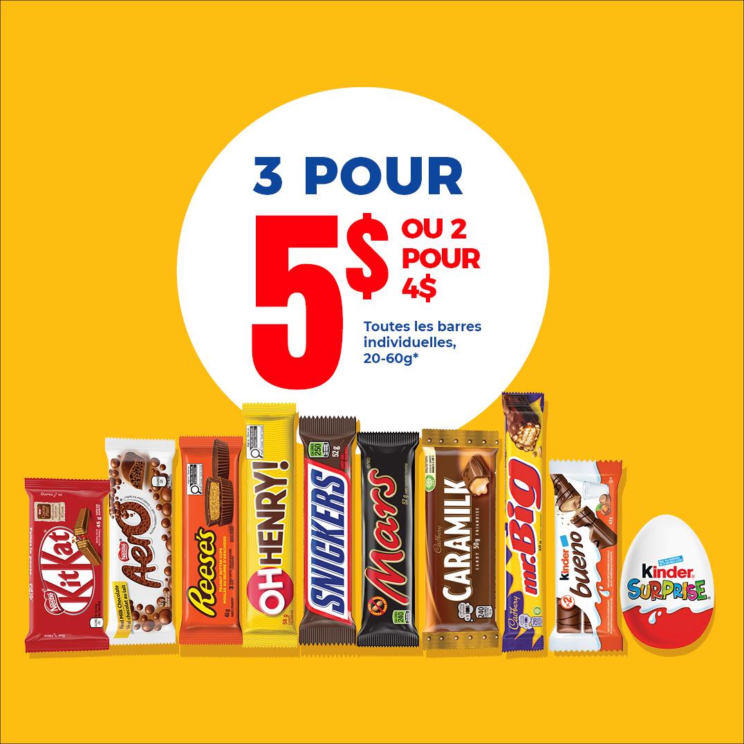 Trois fois plus de choco, trois fois plus de plaisir! Obtenez 3 barres de chocolat individuelles (20–60g) pour seulement 5 $ — ou 2 pour 4 $. Ne manquez pas cette offre gourmande, offerte dans les magasins participants où vous pouvez gagner des Récompenses Journie !