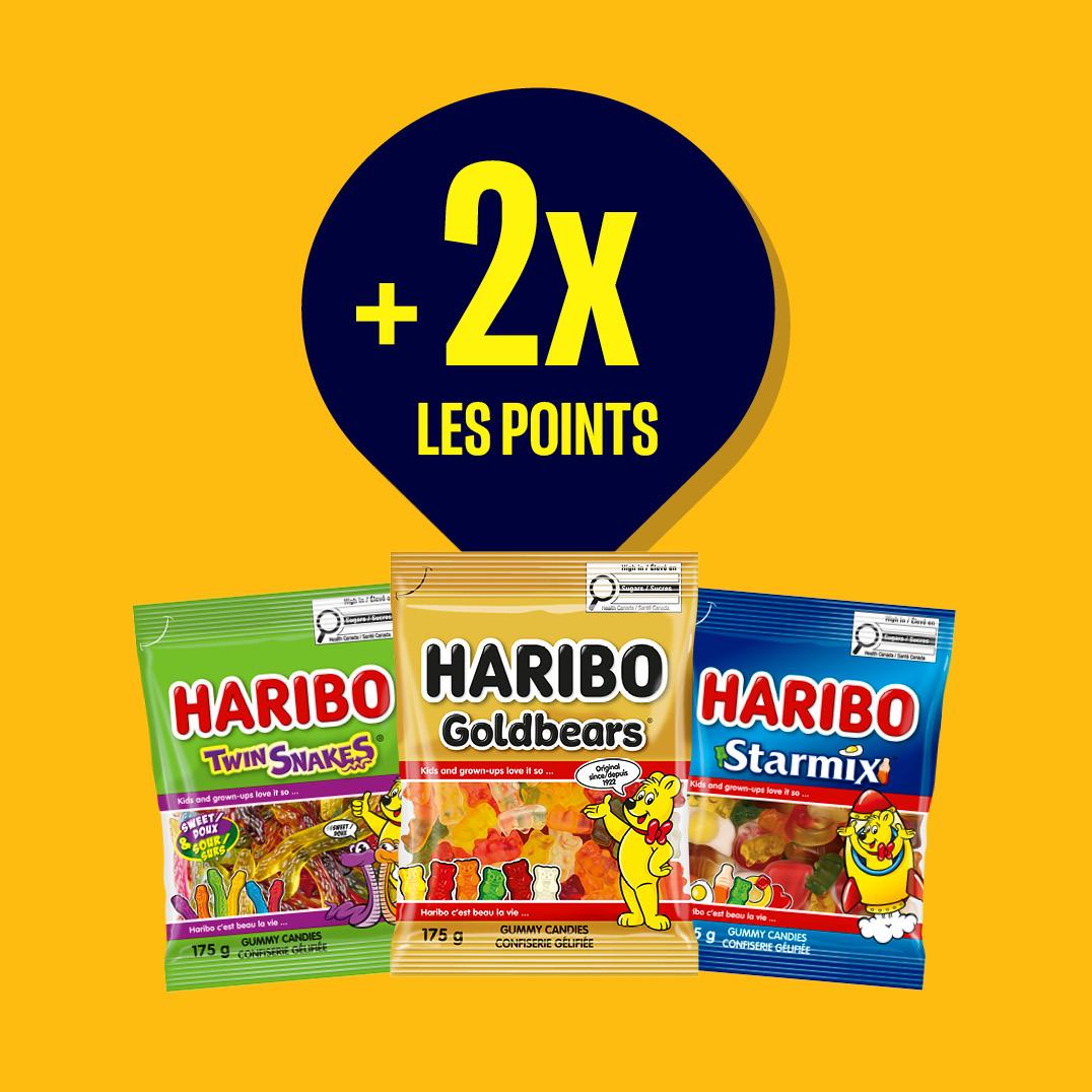 Offrez-vous 2 paquets de bonbons Haribo pour seulement 7 $ et obtenez le double de points ! Égayez votre journée avec cette offre en quantité limitée et accumulez vos récompenses plus vite.