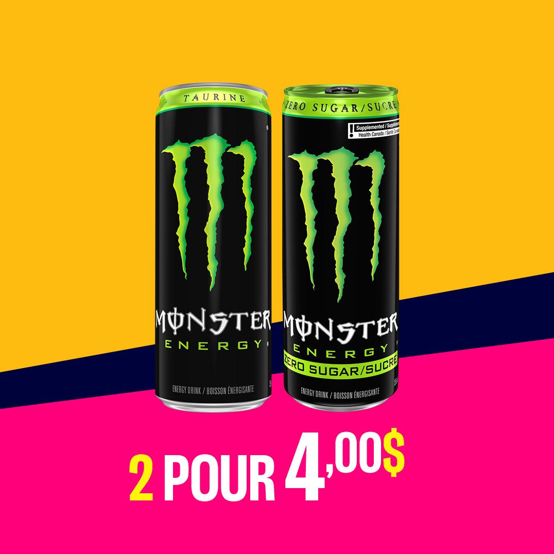 De l’énergie à moindre coût. Pour une durée limitée, achetez 2 boissons énergisantes Monster (355 ml) pour 4 $.