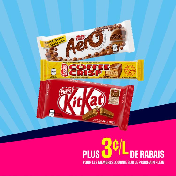 Achetez 3 barres de chocolat Nestlé pour seulement 5,50 $ et économisez 3 ¢/L sur votre prochain plein! Le rabais est porté automatiquement à votre compte Récompenses JournieMC.