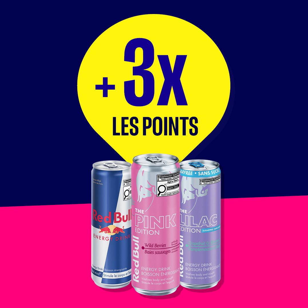Procurez-vous 2 boissons Red Bull pour 7,50 $ et obtenez 3X les points. Que vous partagiez ou non, n’attendez pas pour faire le plein d’énergie et de points!