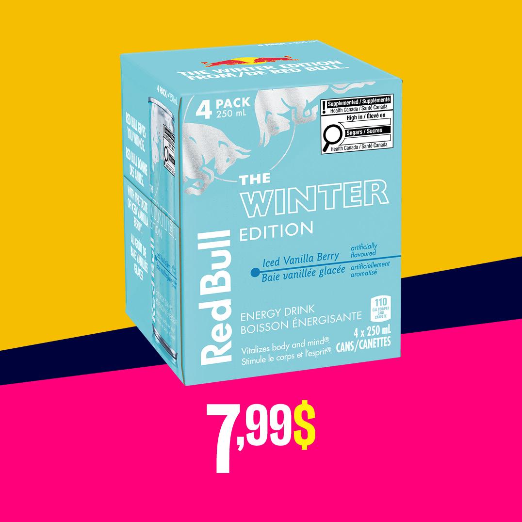 Survivez à la frénésie des Fêtes avec Red Bull! Obtenez un paquet de 4 cannettes (4x250mL) pour seulement 7,99 $. Faites des réserves et le plein d'énergie chaque fois que vous avez besoin d'un p'tit remontant.