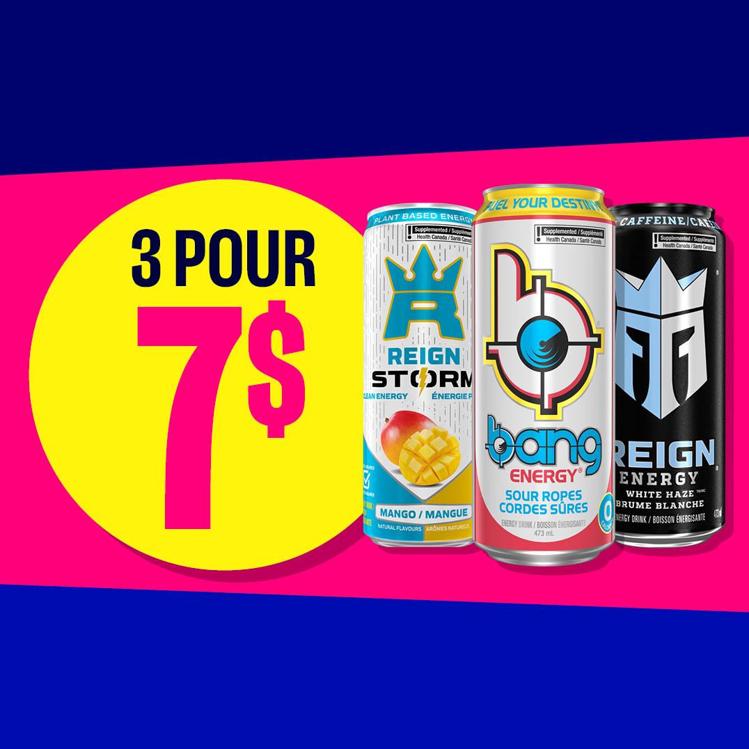 L’offre est en vigueur du 1 avril à 00 h 00 min 00 s au 9 juin 2026 à 23 h 59 min 59 s. Les membres Journie peuvent acheter 3 boissons énergisantes Full Throttle, Bang, ou Reign pour 7 $. Prix non-membre : 3 pour 7,50 $ ou 3,99 $ - 4,79 $ par unité. Des taxes, redevances et consignes s’appliquent, s’il y a lieu. Limite quotidienne de 9 produits par transaction, par personne. Pour consulter la liste des emplacements participantes, visitez le Plan sur l’appli Récompenses Journie ou la page Emplacements à journie.ca pour trouver un emplacement où vous pouvez accumuler des récompenses Journie. Non applicable chez les détaillants indépendants.