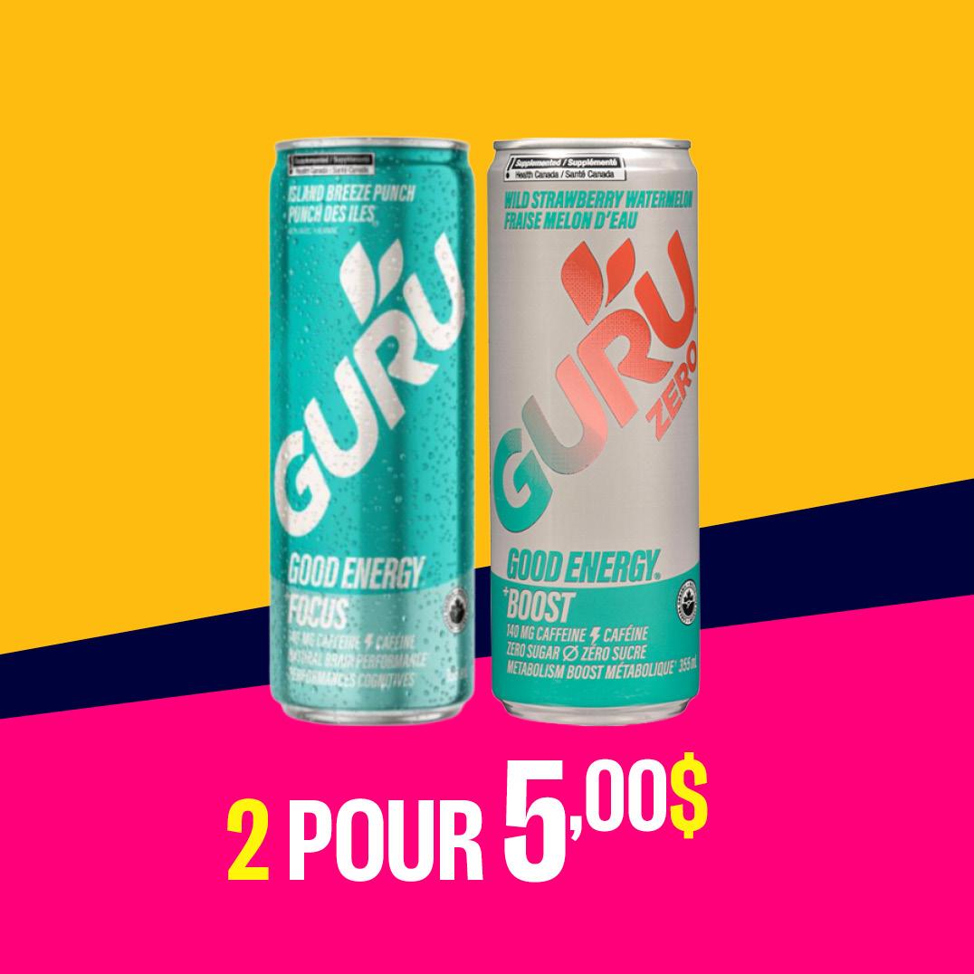 Énergisez votre journée! Pour une durée limitée, achetez 2 boissons énergisantes GURU (355 ml) pour 5 $.