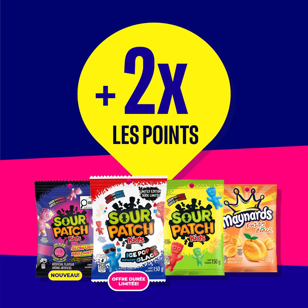 L’offre est en vigueur du 1 avril 2026 à 0 h 00 min 00 s au 9 juin 2026 à 23 h 59 min 59 s. Vous profiterez du multiplicateur de points décrit ci-dessous à l’achat de 2 Maynards ou Sour Patch Kids (135-154g) pour 7 $. Vous obtiendrez 4 points Journie par dollar dépensé sur des produits admissibles achetés dans les points de vente participants. Des taxes, redevances et consignes s’appliquent, s’il y a lieu. Le multiplicateur de points sera appliqué seulement à la valeur des produits admissibles, et non à la valeur totale de l’achat. Limite quotidienne de 6 produits par transaction, par personne. Pour consulter la liste des emplacements participantes, visitez le Plan sur l’appli Récompenses Journie ou la page Emplacements à journie.ca pour trouver un emplacement où vous pouvez accumuler des récompenses Journie. Non applicable chez les détaillants indépendants.